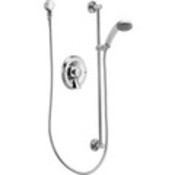 Moen 8346 Handheld Shower System, Shower System > One Handle. Lever Handle-Metal Construction-Hand Shower System (with valve), Include vandal resistant screws and international hot & cold indicators, Posi-Temp, Without volume control, Adjustable temperature limit clip, 1/2" CC connections, 1/4 turn stops, 4 port cycling valve, Handheld shower 2.5 gpm ( 9.5 L/min) max, 69" double swivel hose assembly, 30" slide bar, Vacuum breaker, Drop ell, This bar is NOT a grab bar NOT to be used for support, Specify with 15856 spout for tub. shower application..